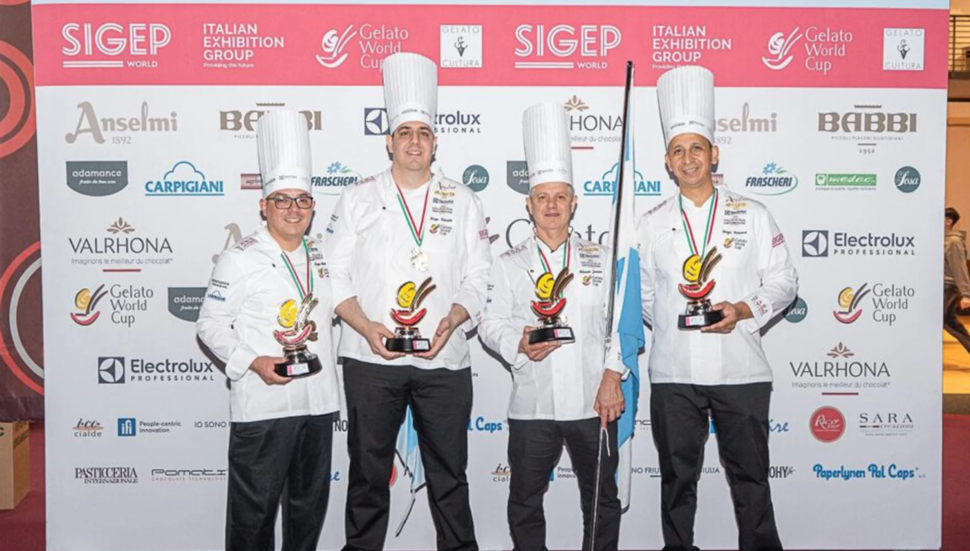 Los desafíos del equipo argentino: A lo largo de esta competencia, la delegación argentina presentó siete elaboraciones y una escultura de chocolate bajo la temática de “Jardín de mariposas” inspiradas en la naturaleza. La primera de las pruebas fue la del “Mistery Box” o caja misteriosa, en la que se sortea un ingrediente sorpresa con el que deben crear un helado, el equipo argentino recibió frambuesa como materia prima frutal base para la preparación. En este sentido, Eduardo Zacaría, Diego Colaneri, Diego Calculli y Sergio Mercado crearon un delicioso sorbete de frambuesa y romero que despertó gran interés por la intensidad de su sabor, color y textura. En el desafío del Vassoio Tronquetto, el equipo argentino presentó una elaboración en forma cilíndrica que lució en su capa externa una base de bizcocho de chocolate, con base crocante con cobertura de helado marrón glacé; junto con un decorado de gelatina de marrón glacé y castañas en almibar. En su interior, una segunda capa de bizcocho de chocolate, helado de gianduia latte y un corazón de helado de sabayón y gelatina de frambuesa; deslumbraron al jurado. Para la prueba de las paletas heladas, el conjunto argentino desarrolló dos presentaciones en forma de alas de mariposas. Una paleta con corazón de mermelada de frutilla, junto con helado de crema agrumanta y helado de pistacho en su interior; con cobertura de chocolate inspiración frambuesa y un decorado de glaseado de hibiscus y frambuesa, gelatina de coco y lima y Tuille negra. Otra paleta con corazón de salsa de caramelo junto con helado de maní tostado y helado de chocolate con leche en su interior; con cobertura de glaseado de mango maracuyá, y decorado con gelatina de mango maracuyá, baño de chocolate blanco y maracuyá y Tuille. En su Monoporción en vidrio o “copa helada”, el helado de mango y lima fue el protagonista, combinado con un bizcocho de lima con crocante. En la parte superior, un sorbet de vainilla e ylang ylang (esencia aromática del perfume Coco Channel) con un centro de gelatina de frambuesa, gelatina de maracuyá y salsa de frambuesa; completaron la presentación.